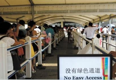 和沙特館一樣,英國館也嚴格采用了世博局的新綠色通道標準。昨天下午2點30分左右,記者在現(xiàn)場看到,一對聾啞夫婦在英國館綠色通道處向工作人員出示了殘疾證,但被工作人員婉拒。工作人員還示意這對夫婦觀看旁邊新修改的綠色通道提示牌,只見上面注明只有三類人可以從綠色通道優(yōu)先進入:1、坐在輪椅上的殘疾人;2、行動不便的殘疾人;3、75歲以上的老人。由于無法提供身份證或老年證,一位老人也不得不遺憾地走向另一個展館。