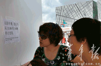 夏日炎炎,為了防止游客因為做劇烈運動,出汗過多而中暑,丹麥館(網(wǎng)上丹麥館)采取了自行車禁租借的措施。記者昨天在世博丹麥館排隊處看到,在醒目的位置貼出了“以防中暑,自行車從11點到16點停止使用”的告示。