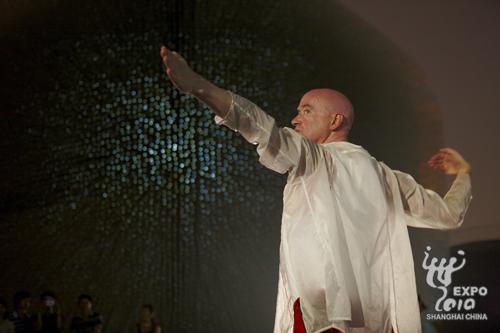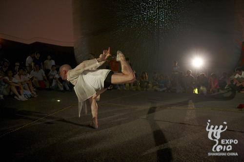 5日晚上,英國藝術(shù)家艾倫·格瑞格(Alan Greig)在“種子圣殿”前展現(xiàn)了精彩絕倫的蘇格蘭現(xiàn)代舞蹈藝術(shù)。艾倫 格瑞格是X Factor舞團(tuán)的藝術(shù)總監(jiān),他的舞蹈作品集運(yùn)動、刺激與娛樂性于一體,此次演出片段是根據(jù)他在2009年上海舞蹈節(jié)中首演的獨(dú)舞《Into the Light》改編而成。