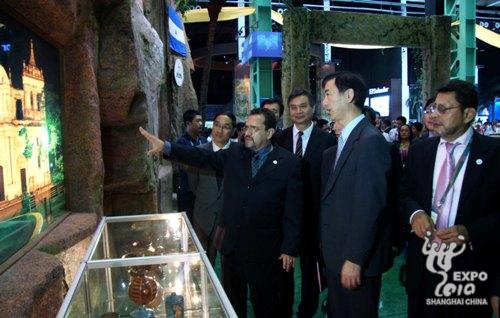 李建平一行中國客人對尼加拉瓜國家館的展示表示出濃厚的興趣