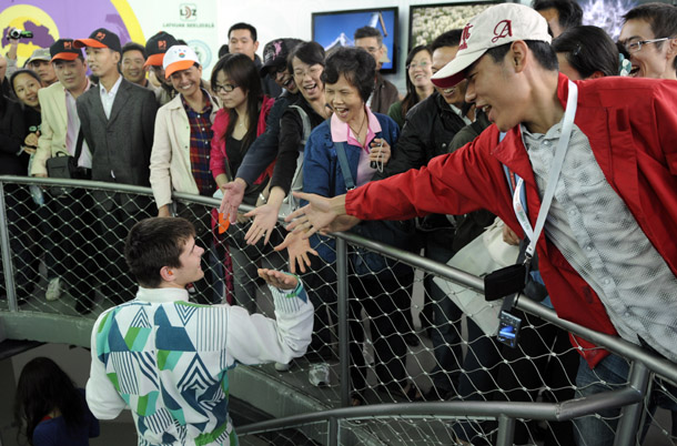 盡管拉脫維亞館的飛行表演每次只有大約10分鐘,但常常引來驚呼尖叫不斷。當(dāng)“飛人”滿頭汗水走出風(fēng)洞的時候,立刻成為觀眾集體致敬的對象。對于大家的崇拜,雷納斯孩子般的臉上滿是得意的笑容!拔蚁矚g飛在空中的感覺,把自己的身體交給風(fēng),交給自然,我總是能在飛行中找到快樂。”雷納斯說。在他看來,當(dāng)“飛人”其實就是為了享受簡單的快樂。