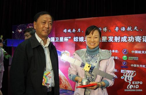 14日上午,上海世博會(huì)太空家園館舉行“寄語(yǔ)嫦娥”寄語(yǔ)征集活動(dòng)頒獎(jiǎng)儀式。中國(guó)航天科技集團(tuán)公司副總經(jīng)理吳卓為優(yōu)秀寄語(yǔ)作者頒獎(jiǎng),30名獲獎(jiǎng)?wù)叻謩e獲得極具紀(jì)念意義的“嫦娥二號(hào)”衛(wèi)星模型。