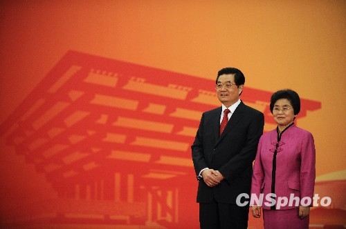4月30日晚,中國(guó)國(guó)家主席胡錦濤攜夫人劉永清為出席上海世博會(huì)開幕式的貴賓舉行迎賓儀式和歡迎宴會(huì)。圖為胡主席夫婦恭候貴賓。 中新社發(fā) 廖攀 攝