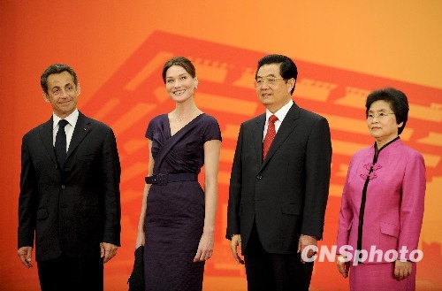 4月30日,中國(guó)國(guó)家主席胡錦濤和夫人劉永清在上海歡迎出席世博會(huì)開幕式的法國(guó)總統(tǒng)薩科齊和夫人布呂尼。 中新社發(fā) 廖攀 攝