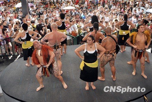 7月25日,上海世博園新西蘭館(網(wǎng)上新西蘭館)前的舞臺上,幾名身著傳統(tǒng)服飾、全身布滿粗獷紋身的毛利人表演土著舞蹈“哈卡戰(zhàn)舞”。舞蹈熱情似火,深深感染著現(xiàn)場觀眾,不時博得陣陣掌聲。 中新社發(fā) 殘弓 攝