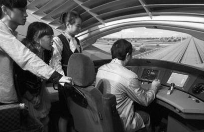 在鐵路館二樓,游客可以對“和諧號”380A的駕駛艙一睹為快。高鐵駕駛艙像一顆子彈頭的前半部分,操作界面相當簡單,而且控制桿比一旁的重型電力機車駕駛室少得多。透過駕駛艙向外看,兩根鐵軌一直在延伸好像沒有盡頭,而兩旁的車站、電線桿、房子等景色栩栩如生。即使列車沒有開動,也能聽到外面有列車呼嘯而過。據(jù)介紹,動車組駕駛艙的整體價格超過800萬元。在這里,你可以當一回動車組司機,沿著“京津城際鐵路”風馳電掣地飛奔,也可以駕駛大功率電力機車,在“青藏鐵路”上欣賞雪域高原的天光云影,或者在我國能源大動脈“大秦鐵路”上一路前行感受風光。
