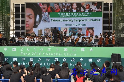 海峽之聲網(wǎng)上海站7月6日電(記者張玉龍)作為中國2010年上海世博會青年周暨世界名校大聯(lián)歡開幕式之后的第一場演出,今天上午在世博會浦西園區(qū)博覽廣場舉行的“臺灣大學交響樂團”專場演出,因為其作品展現(xiàn)了極具臺灣地方特有傳統(tǒng)文化而格外受到觀眾好評。