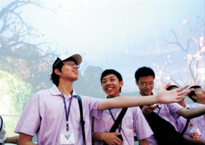 昨日,滬臺學(xué)生在臺灣館內(nèi)欣賞可“聞花香、嘗雨趣”的4D電影時,情不自禁伸出手感受落下的雨滴