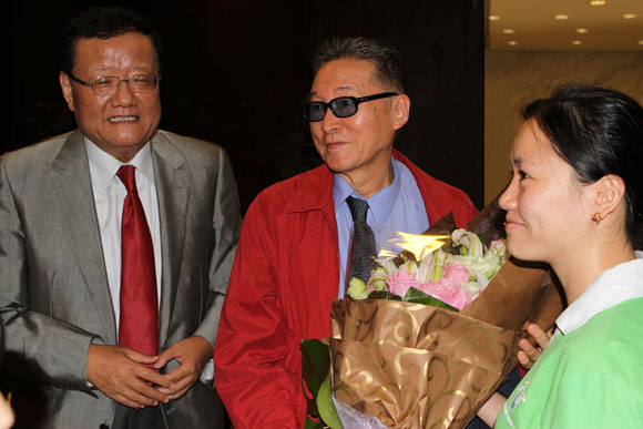 8月26日,世博志愿者在機(jī)場向李敖鮮花。