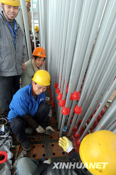 11月29日,兩位工人在上海世博園區(qū)信息通信館施工現(xiàn)場(chǎng)忙碌。新華社發(fā)(許叢軍 攝)