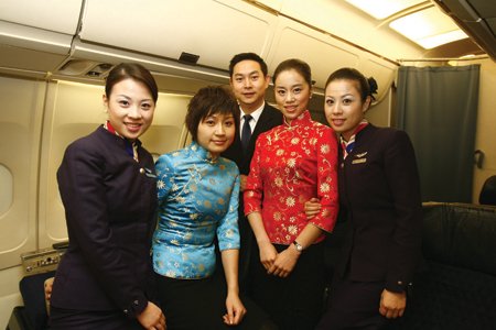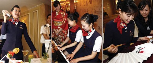 除了專業(yè)的技能,這些被挑中的成員也個(gè)個(gè)“身懷絕技”,“有會(huì)茶藝的,會(huì)唱戲的,會(huì)插花的,還有專門(mén)到酒店經(jīng)過(guò)烹飪培訓(xùn)的,世博會(huì)期間,組員們都會(huì)在航班上為旅客們表演這些拿手絕活。到了明年5月,我們還將增加人數(shù),更好地為世博服務(wù)。”