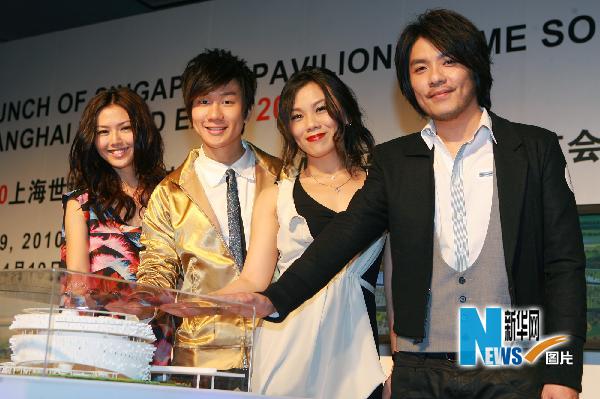 4月19日,新加坡歌手孫燕姿、林俊杰、蔡健雅、阿杜(從左至右)共同出席上海世博會新加坡館主題曲《感動每一刻》音樂電視的首發(fā)新聞發(fā)布會。新華社發(fā)(朱良城 攝)