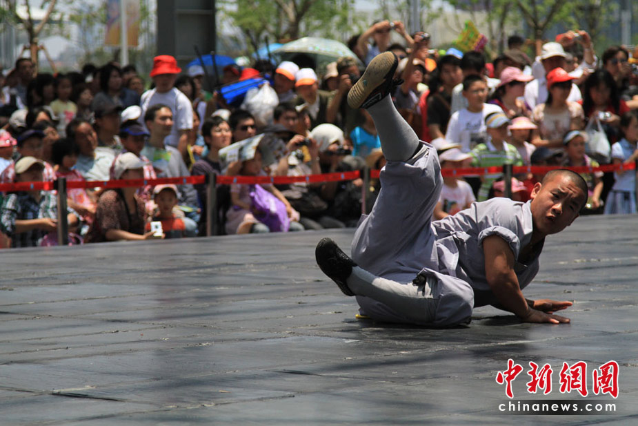 自5月1日開始,上海世博園D片區(qū)綜藝廣場每天都有少林寺功夫展演,受到世博參觀者的熱捧。中新社記者 殷春永攝