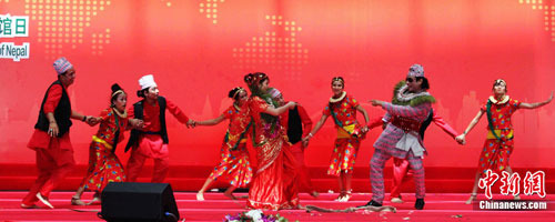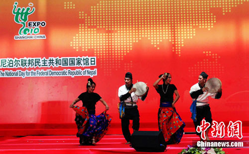 9月3日,上海世博園迎來尼泊爾聯(lián)邦民主共和國國家館日。當日在世博中心舉行的官方儀式上,身著尼泊爾特色服飾的藝術(shù)家表演當?shù)刂纳降匚璧。中新社記?nbsp;郭虹 攝