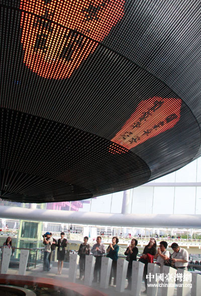 步入臺灣館,映入眼簾的是鑲嵌有很多小屏幕的不銹鋼墻體,墻體上刻畫著代表臺灣山水與城市的抽象線條。林志玲、陶晶瑩、郭臺銘等臺灣名人現(xiàn)身熒幕,親切地推介臺灣的美麗,游客們也從他們的講述中,對寶島的人文、景觀與現(xiàn)代有了更為直觀的認知。