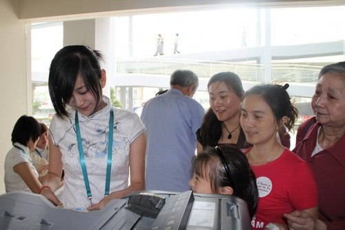 震旦館的敲章處和其他館最大的不同是,除了為參觀游客在世博護(hù)照上面敲章外,還可免費為游客打印一張個性風(fēng)景照并在上面敲章。在敲章處的墻壁上,掛著三幅風(fēng)景畫,分別是外灘全景、良渚文化遺址和紅山文化遺址。游客可以任選其中一幅來打印并敲章。在靠墻的地方,整齊的放著四部運轉(zhuǎn)中的打印機。