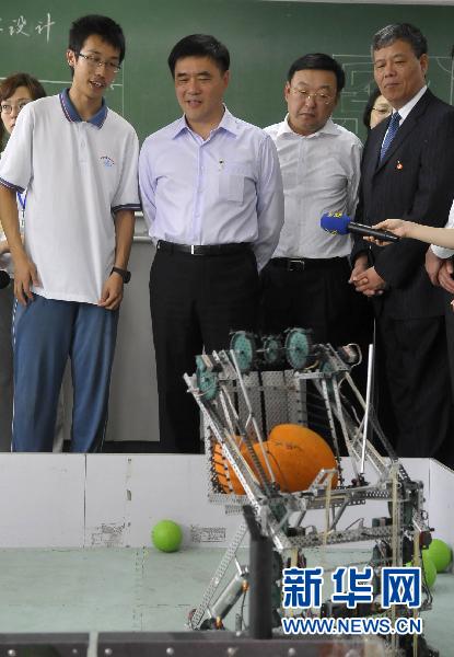 6月17日,上海市復(fù)興高級(jí)中學(xué)的學(xué)生在向郝龍斌市長(zhǎng)(前左二)介紹自己設(shè)計(jì)的“搬運(yùn)機(jī)器人”。當(dāng)日,在上海訪問(wèn)的臺(tái)北市長(zhǎng)郝龍斌參觀上海市復(fù)興高級(jí)中學(xué),并與青年學(xué)生圍繞求學(xué)成才、科技創(chuàng)新、環(huán)境保護(hù)等問(wèn)題進(jìn)行交流。 新華社記者裴鑫攝