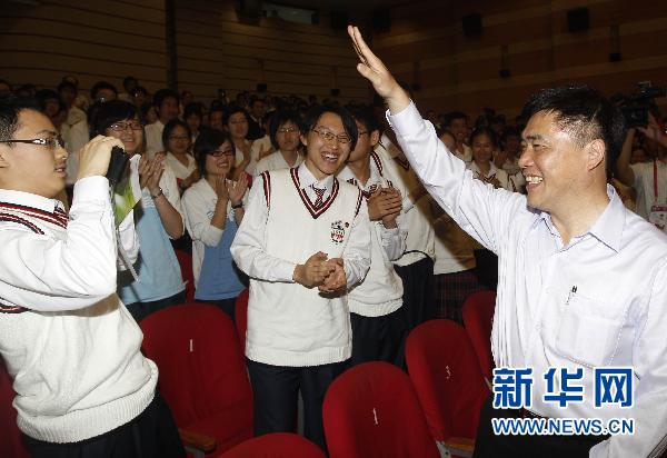 6月17日,郝龍斌與上海市復(fù)興高級(jí)中學(xué)的學(xué)生們?cè)谝黄鸾涣。?dāng)日,在上海訪問(wèn)的臺(tái)北市長(zhǎng)郝龍斌參觀上海市復(fù)興高級(jí)中學(xué),并與青年學(xué)生圍繞求學(xué)成才、科技創(chuàng)新、環(huán)境保護(hù)等問(wèn)題進(jìn)行交流。 新華社記者裴鑫攝