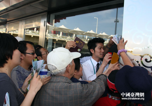參觀完臺(tái)灣館的游客簇?fù)碓诔隹谔,讓工作人員在自己的“世博護(hù)照”上蓋上臺(tái)灣館的印章。(中國臺(tái)灣網(wǎng) 鐘寶華 攝)