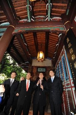 4月8日,上海市長韓正、親民黨主席宋楚瑜等在臺(tái)北縣林家花園來青閣接受媒體聯(lián)合采訪