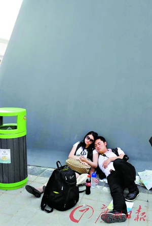 一對(duì)情侶逛累了,就地坐下打盹