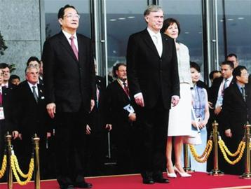 儀式前,中外雙方舉行了會談;羲固亍た死赵谟嵴暸阃鲁鱿松靸x式。隨后,雙方來到世博軸一號陽光谷出席慶祝活動,并觀看了充滿濃郁德國氣息的文藝演出。