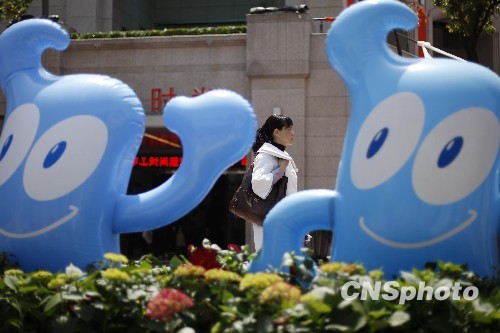 資料圖:上海街頭的世博會(huì)吉祥物海寶和行人。 中新社發(fā) 盛佳鵬 攝