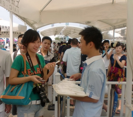 隨著近日高溫天氣的出現(xiàn),汽車館在降溫措施方面進一步提高了人性化的服務(wù),根據(jù)氣溫的高低,在35度以上的天氣,每天下午從13:00至17:00在戶外排隊區(qū)域的1-2號蓬為排隊等候的觀眾發(fā)放冷毛巾,以便大家擦汗、降溫,每天預(yù)計發(fā)放3000條,并且在38度以上的天氣,每天14:00給戶外1-2號蓬排隊的觀眾發(fā)送冰塊,讓大家用小毛巾包著冰塊,以便降溫防暑,每天預(yù)計發(fā)出500份。另外,汽車館為減少老人在酷暑中等待的時間,在戶外排隊區(qū)域,在高溫天氣的幾個高溫時段,為排隊中的75歲以上的老人發(fā)放當天的預(yù)約券。