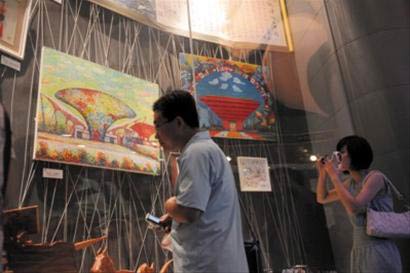 游客正在觀賞陳錦芳的世博畫 周斌 現(xiàn)場圖片