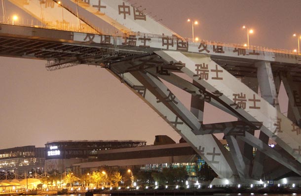 盧浦大橋的宏美結(jié)構(gòu)以及橋梁本身的紐帶意義使霍夫施泰特爾靈感閃現(xiàn),將各種寓意兩國(guó)緊密相連、友誼源遠(yuǎn)流長(zhǎng)的影像盛裝素裹在氣勢(shì)恢弘的盧浦大橋上。今天晚上,融入了大量?jī)蓢?guó)國(guó)旗設(shè)計(jì)元素的內(nèi)容在大橋上翩躚起舞,將其裝點(diǎn)成一件令人嘆為觀止的藝術(shù)作品。其中包括瑞士國(guó)旗的“十字”和中國(guó)國(guó)旗的“五角星”圖案、數(shù)字“60”以及漢字“中國(guó)瑞士友誼”等標(biāo)志性圖案。不僅如此,一支來(lái)自瑞士的樂(lè)隊(duì)也在大橋附近的江邊和樂(lè)齊鳴,共慶這一特殊時(shí)刻。