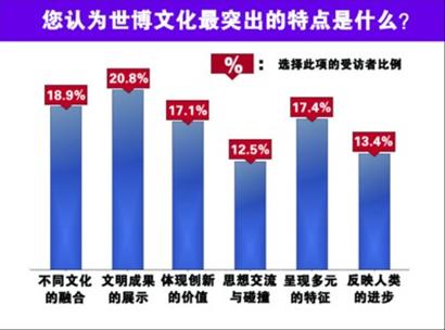 本次調(diào)查中,20.8%的受訪者認為,上海世博會的文化特點是人類文明成果的集中展示;其次是不同區(qū)域、種族文化的融合;而呈現(xiàn)在參觀者面前的,確確實實是文化的多元化特征。