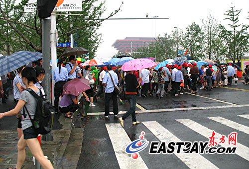 6號(hào)門(mén)入口外的志愿者服務(wù)站站長(zhǎng)汪愛(ài)華則從專(zhuān)業(yè)服務(wù)人員的角度為記者分析了入園人數(shù)爆棚的現(xiàn)象,她認(rèn)為上海居民手中世博大禮包6月票的時(shí)限將近、外地游客報(bào)旅行社早已定好時(shí)間以及海外游人數(shù)量的增加是主要客觀(guān)原因,而人們不約而同地認(rèn)為“雨天人少我們快去”則是出于主觀(guān)!按笥隄膊粶缬稳说臒崆,只是大家湊巧想到了一起而已。”