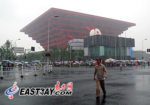 6月29日上午11時(shí)左右,一位男游客不打傘走在雨中,身后的中國(guó)館下人頭攢動(dòng)