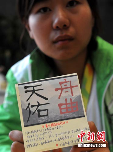 8月11日,來自上海交通大學(xué)的大二學(xué)生閆藝銘,用自己一個月前在甘肅舟曲縣第一初級中學(xué)支教時(shí)所拍攝照片,為舟曲特大泥石流災(zāi)害制作了特別的募捐提示卡,卡上提示,愛心人士可通過手機(jī)短信方式,向甘肅紅十字會捐款。她自制的一百張捐款提示卡,當(dāng)天已經(jīng)向世博志愿者發(fā)出五十多張。她想通過世博園內(nèi)的志愿者,為舟曲災(zāi)區(qū)進(jìn)行廣泛募捐。