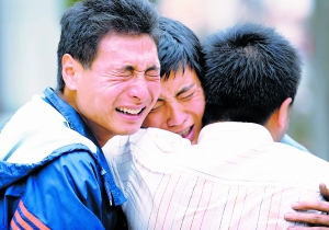 在四川安縣,三位困在大山里三天的災(zāi)民翻山越嶺,艱難跋涉三十多公里終于走出大山后,情不自禁地抱頭痛哭。 新華社記者 李曉果 攝