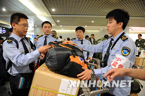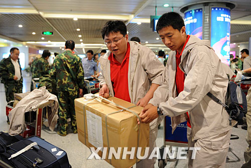 6月3日晚,來自遼寧省衛(wèi)生防疫系統(tǒng)的救災(zāi)隊(duì)員在成都雙流機(jī)場(chǎng)領(lǐng)取行李。