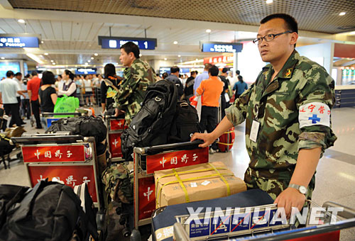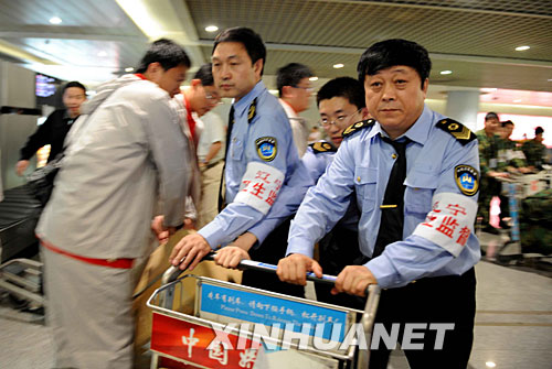 當(dāng)日,來自遼寧省沈陽(yáng)市、盤錦市、丹東市、鐵嶺市等地衛(wèi)生防疫系統(tǒng)的108名救災(zāi)隊(duì)員飛抵成都,準(zhǔn)備投入地震災(zāi)區(qū)一線的防疫工作。 新華社記者張領(lǐng)攝