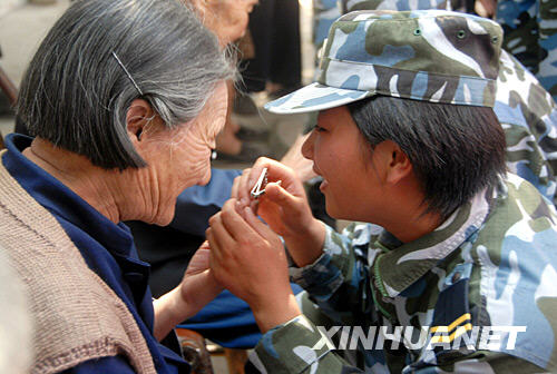 6月3日上午,在四川省什邡市師古鎮(zhèn)敬老院,一名女兵為一位老奶奶剪指甲。