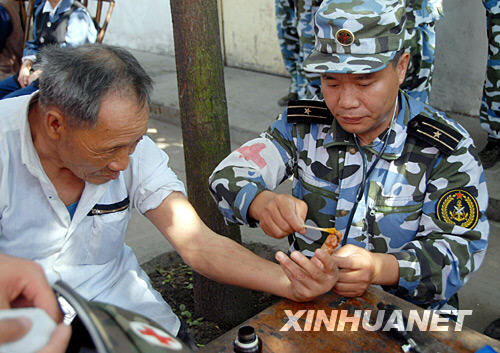 6月3日上午,在四川省什邡市師古鎮(zhèn)敬老院,一位軍醫(yī)為一位老人擦藥。 新華社發(fā)