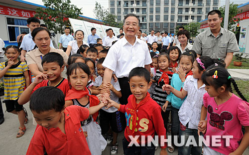 9月2日,溫家寶來到都江堰新建小學(xué)過渡板房學(xué)?赐⒆觽儠r,孩子們簇?fù)碓诳偫砩磉叀?/P>