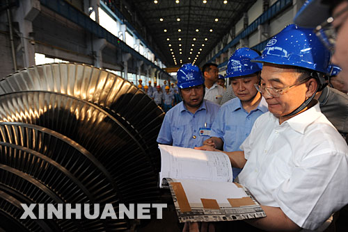 9月1日,溫家寶在德陽市漢旺鎮(zhèn)東方汽輪機(jī)廠視察生產(chǎn)恢復(fù)情況。新華社記者 黃敬文攝
