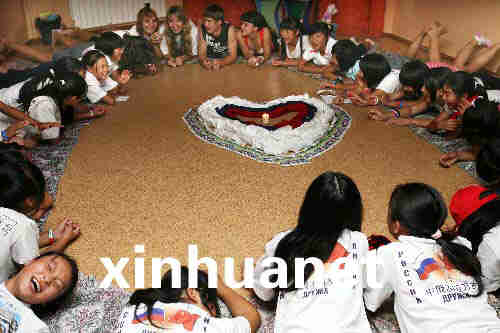 8月4日,在俄羅斯“海洋”全俄兒童中心,來自中國四川地震災(zāi)區(qū)的孩子們和俄羅斯輔導(dǎo)員共同參加燭光晚會。新華社記者鄭悅攝