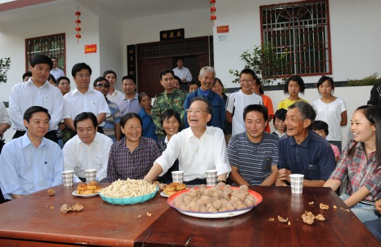 9月24日,溫家寶在青川縣涼水鎮(zhèn)涼華村災(zāi)后村民新居院內(nèi)向村民了解安居房建設(shè)情況。新華社記者黃敬文攝