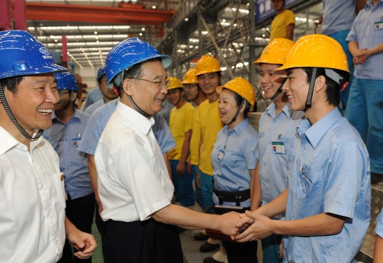 9月25日,溫家寶在東方汽輪機(jī)有限公司新生產(chǎn)基地看望一線工人。新華社記者黃敬文攝
