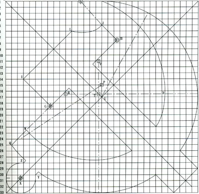1  將一正方形分為32等分,分格線條編號為橫向1~33,豎向1′~33′。畫出對角線AC、BD。