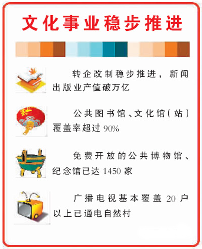 覆蓋城鄉(xiāng)的公共文化服務(wù)體系加快建立,人民群眾的基本文化權(quán)益得到有效保障!笆晃濉币詠恚参幕⻊(wù)體系建設(shè)已經(jīng)進入快速、穩(wěn)定的重要發(fā)展期。2009年,縣級公共圖書館、文化館、鄉(xiāng)鎮(zhèn)(街道)文化站覆蓋率達到90%以上,基本實現(xiàn)了“鄉(xiāng)鄉(xiāng)有綜合文化站”的目標;全國向社會免費開放的公共博物館、紀念館已達1450家,文化輻射力空前提高。