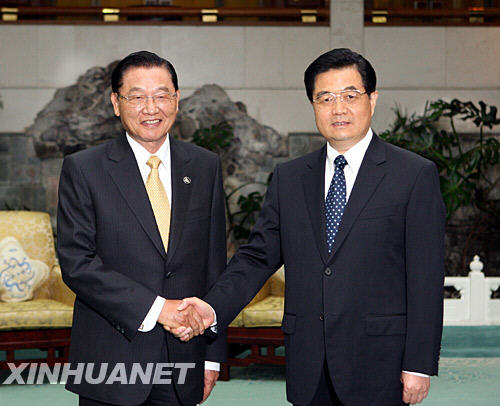 6月13日,中共中央總書記胡錦濤在北京釣魚臺(tái)國賓館會(huì)見臺(tái)灣;鶗(huì)董事長江丙坤一行。 新華社記者劉衛(wèi)兵攝
