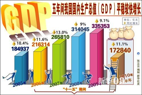 新華社圖表,北京,2010年10月11日圖表:五年間我國國內(nèi)生產(chǎn)總值(GDP)平穩(wěn)較快增長新華社發(fā)
