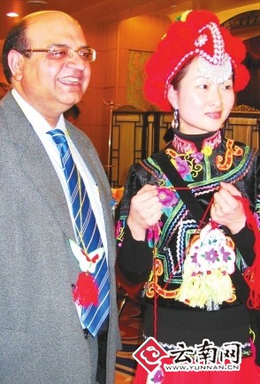 印度客人激動地接受了彝家小阿妹送上的荷包,他樂呵呵地說:“I Love Yunnan!”