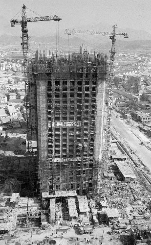 1980年8月,中國政府正式批準(zhǔn)建立深圳經(jīng)濟(jì)特區(qū),隨后又在珠海、汕頭、廈門、海南建立特區(qū)。在中國改革開放的進(jìn)程中,深圳經(jīng)濟(jì)特區(qū)一直發(fā)揮著“試驗(yàn)田”的作用,創(chuàng)下了物價(jià)改革、企業(yè)產(chǎn)權(quán)轉(zhuǎn)讓、住房制度改革等眾多個(gè)“中國第一”。 圖為正在興建的共48層的廣東深圳國際貿(mào)易大廈(1983年3月攝)。1983年廣東省深圳經(jīng)濟(jì)特區(qū)竣工建筑面積達(dá)130萬平方米,建成37條標(biāo)準(zhǔn)馬路,正在施工的63幢高層建筑有18幢竣工,為外商投資設(shè)廠提供了良好條件。
